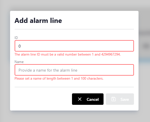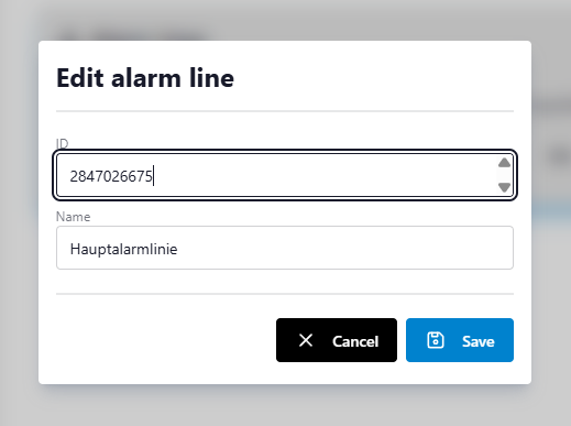 Enter a descriptive name (1-100 characters) to identify this alarm line. Use meaningful names like "First Floor", "East Wing", or "Building A - Zone 1" to help distinguish between multiple alarm lines. - The ID must be between