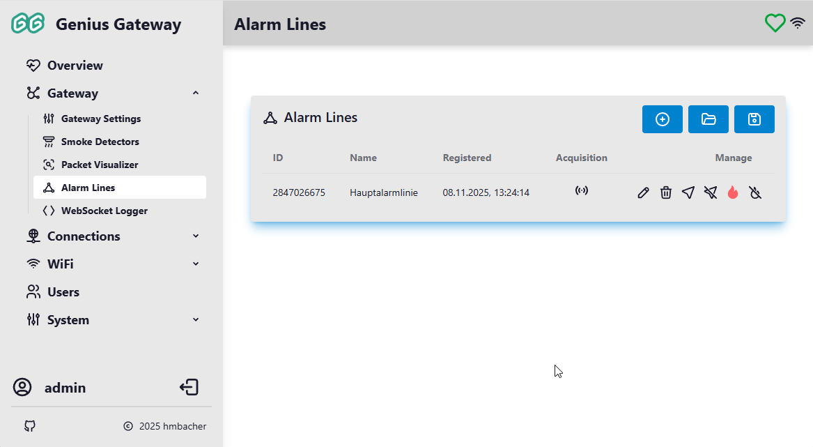 The Alarm Lines Management page provides a centralized interface for configuring and managing alarm lines in your Genius system. Alarm lines represent logical groupings of smoke detectors that communicate using the same radio ID, enabling coordinated alarm behavior across connected devices. This page allows you to add, edit, delete, and test alarm lines, as well as manage configurations via export/import functionality.