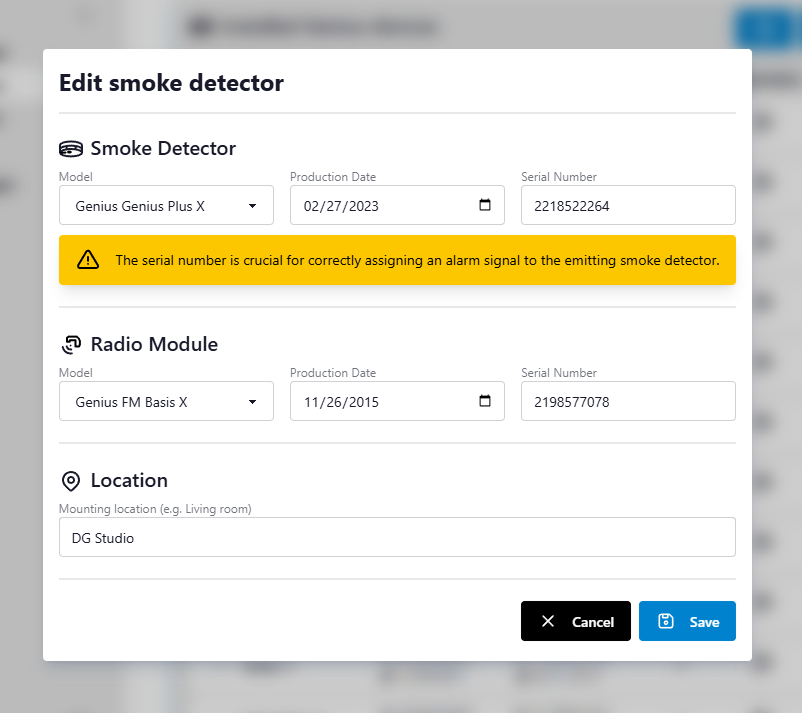 The system validates all inputs and prevents duplicate serial numbers for both smoke detectors and radio modules.