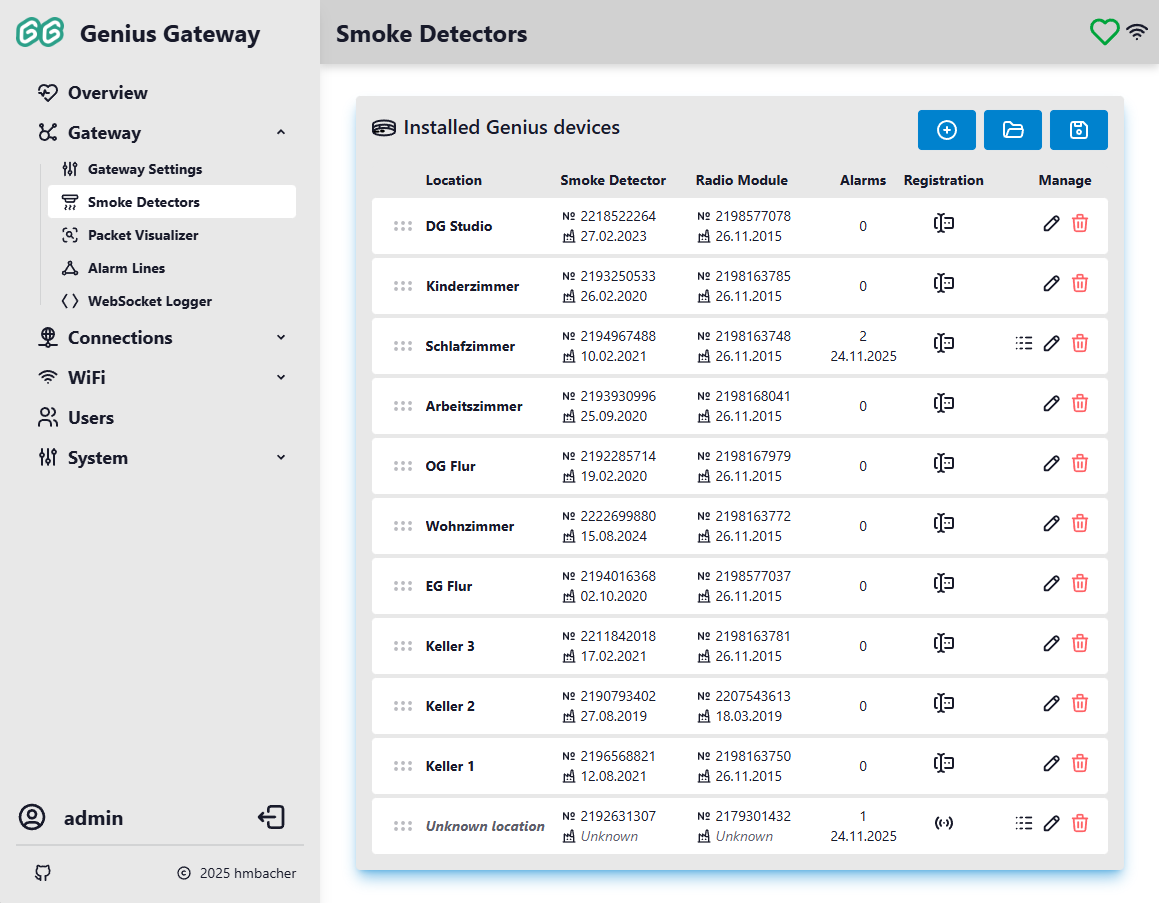 In addition to manually adding devices, the Genius Gateway can automatically discover and register smoke detectors when they trigger an alarm. This feature requires the "Process alerts from unknown smoke detectors" setting to be enabled in Gateway Settings.
