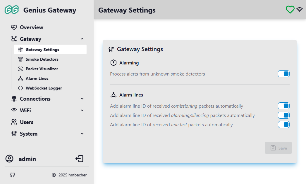 The Gateway Settings allow you to configure the automatic behavior of the Genius Gateway when processing radio communications from Hekatron Genius Plus X smoke detectors. These settings determine how the gateway responds to different types of packets and whether it automatically adds newly discovered devices or alarm line IDs.