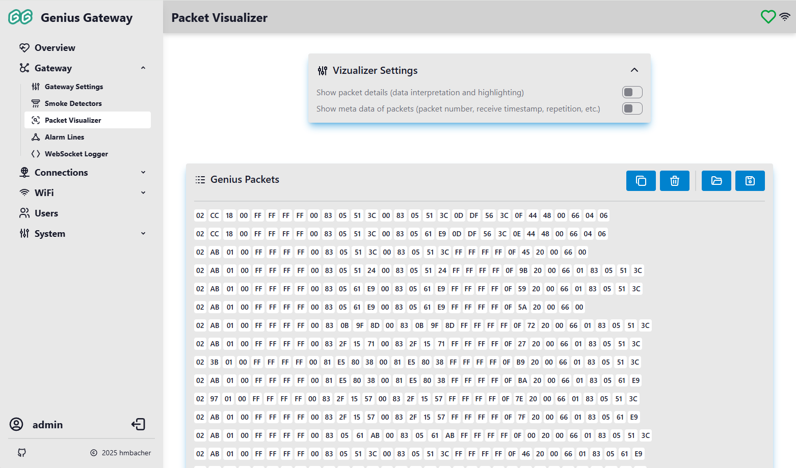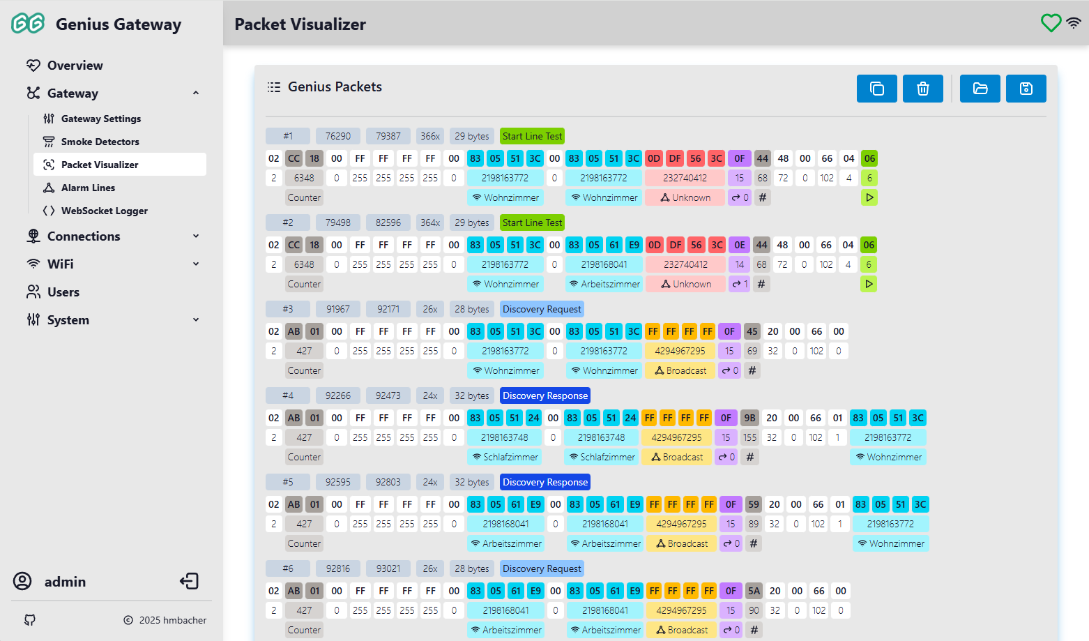 The Packet Visualizer provides real-time monitoring and analysis of RF communication packets from Hekatron Genius Plus X smoke detectors. This powerful diagnostic tool allows you to observe the wireless communication in your smoke detector network, helping with troubleshooting, protocol analysis, and system verification.