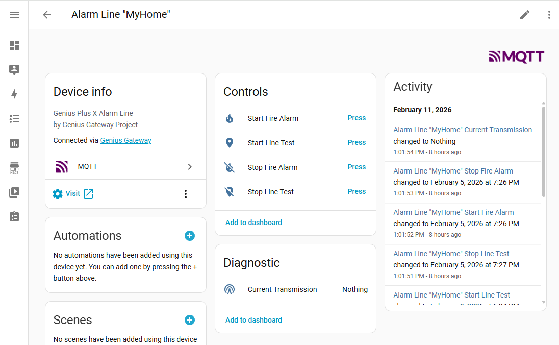 Each alarm line registered in Genius Gateway is automatically published to Home Assistant as an individual device with multiple entities for remote control and monitoring.