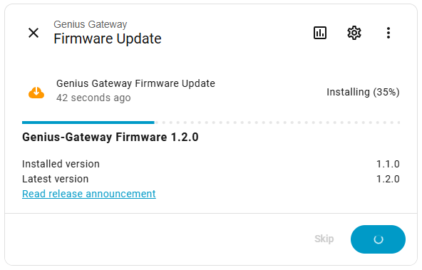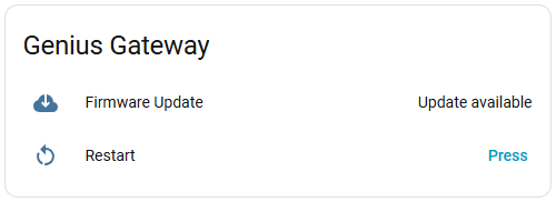 The Genius Gateway's Update Entity signalizing an available firmware update