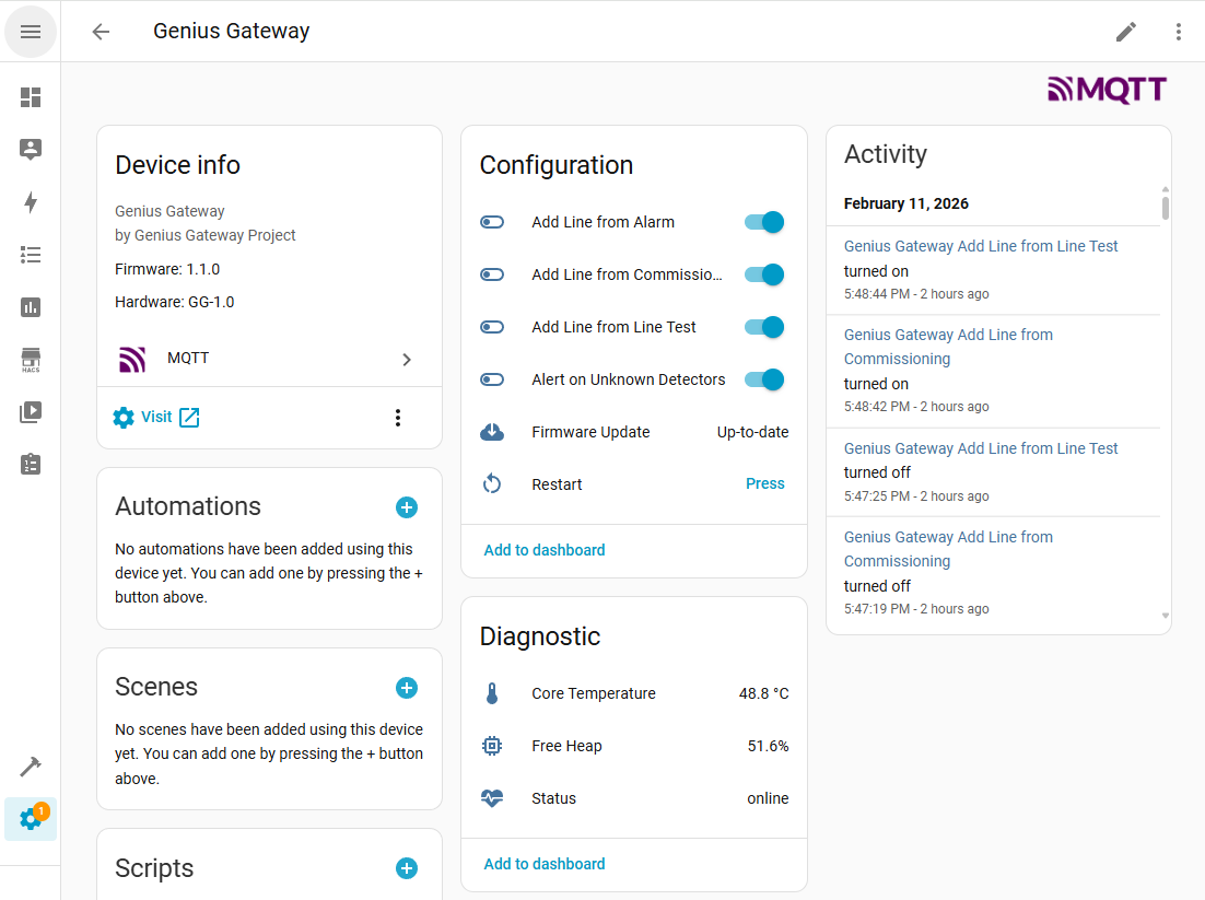 The Genius Gateway itself is automatically published to Home Assistant as a device when Home Assistant Integration is enabled. This provides comprehensive monitoring and remote control capabilities for the gateway itself.