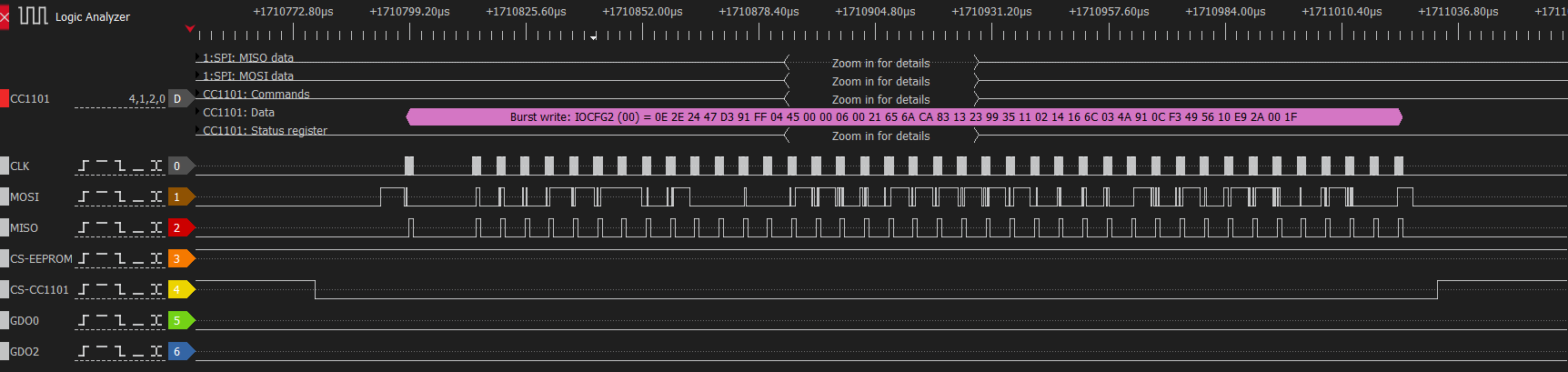 Figure 1: Logic analyzer capture showing CC1101 burst write initialization sequence