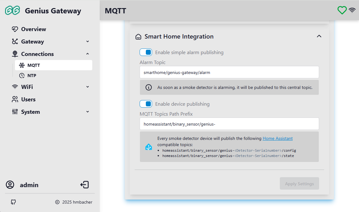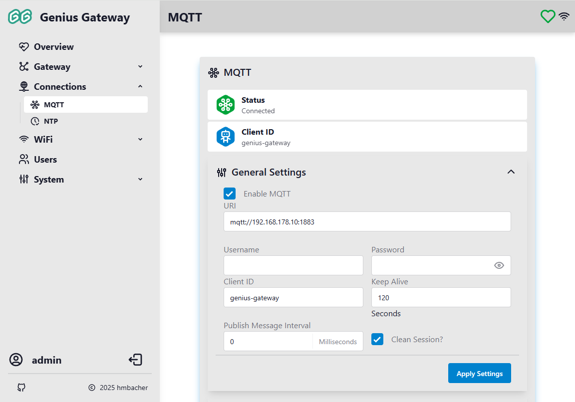 Click Apply Settings to save and apply the MQTT configuration. The device will reconnect to the MQTT broker with the new settings.