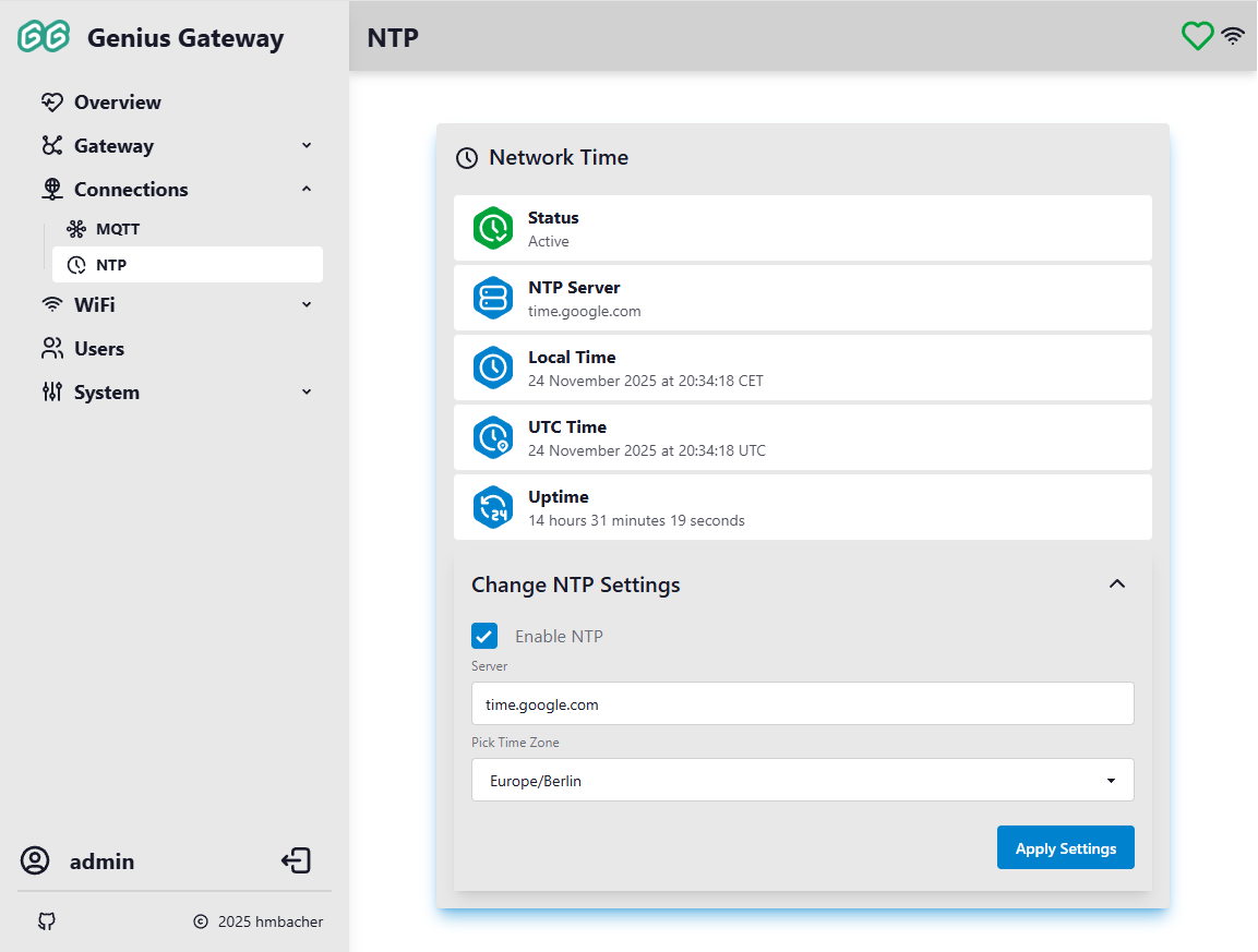 The Connections pages configure external network services that the Genius Gateway can integrate with, including MQTT for smart home integration and NTP for accurate time synchronization.