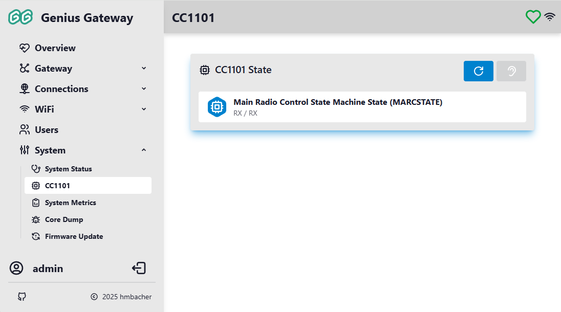 The CC1101 page displays the current state of the CC1101 radio transceiver chip used for communication with smoke detectors. This page is only accessible to administrators and only available if the CC1101 controller feature is enabled.