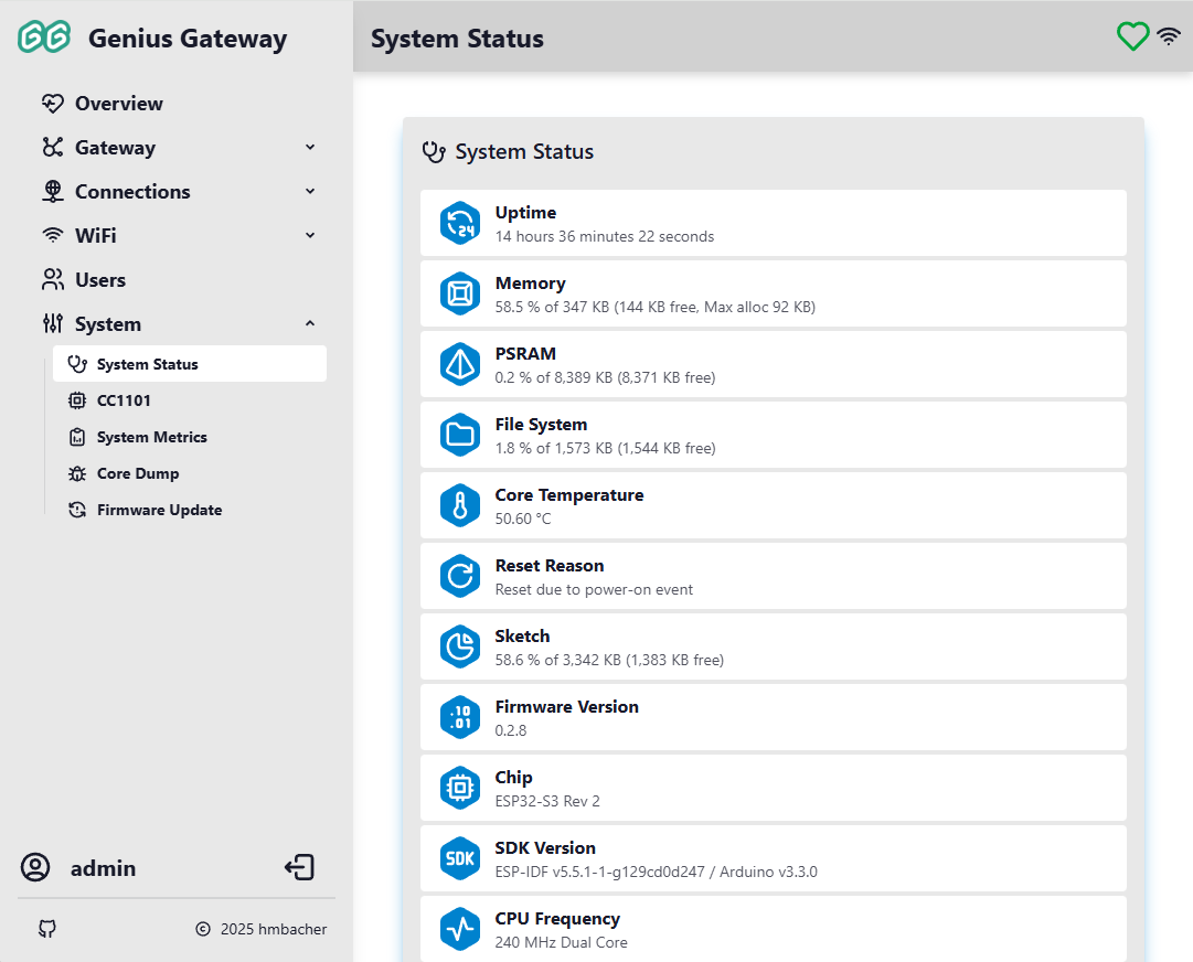 The System pages provide comprehensive information about the Genius Gateway's hardware status, performance metrics, diagnostic tools, and firmware management capabilities.
